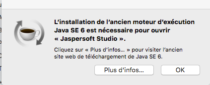 Recently I downloaded Jaspersoft studio on my Mac OSX but I was having trouble laughing the app as the system kept telling me I needed the older runtime version of Java, as you can see from the screenshot below (sorry in french)
